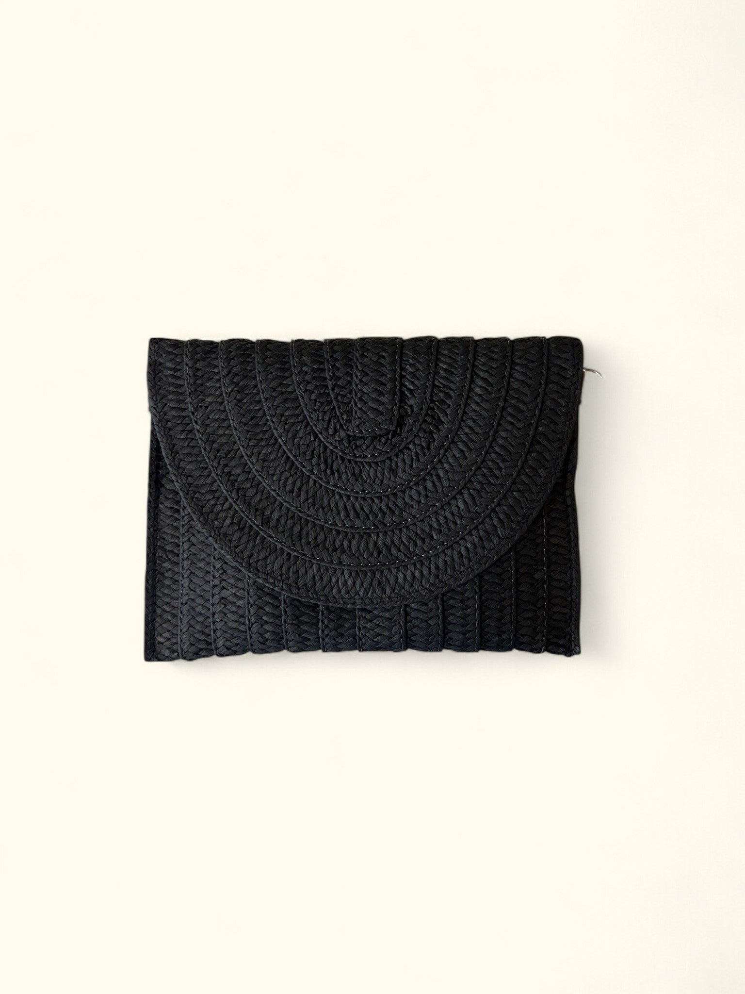 Este clutch de rafia natural es una oda a la artesanía y al estilo bohemio chic. Su diseño en semicírculos trenzados aporta textura y simetría, logrando una pieza versátil que complementa desde looks de día hasta estilismos más relajados para tardes de verano.