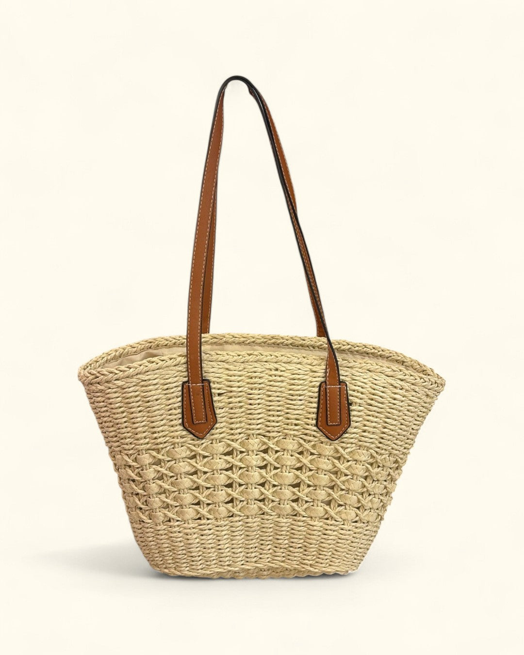 Capazo de estilo natural con un diseño trenzado en la parte inferior que le da un toque artesanal y único. Ideal para acompañarte a la playa, al mercado o en tus escapadas de verano.