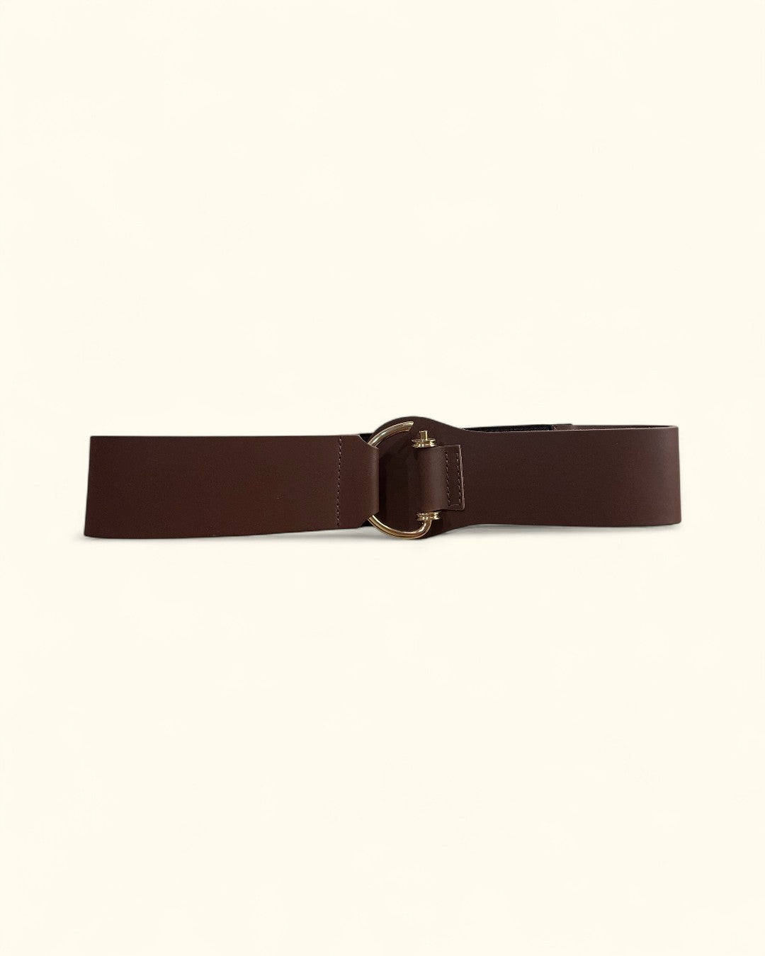 Cinturón ancho fabricado en piel suave de tono chocolate, ideal para marcar la cintura sobre vestidos, americanas o camisas oversize. Su diseño elegante con hebilla metálica dorada aporta un toque sofisticado a cualquier look.
