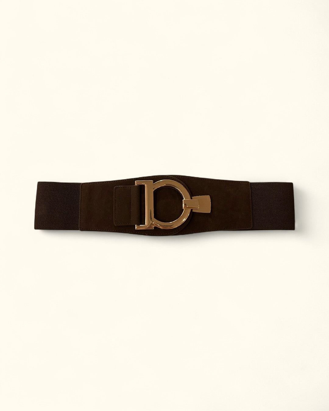 Cinturón elástico con pieza frontal de ante marrón y hebilla metálica dorada en forma de “D”. Ideal para llevar sobre prendas de punto, blazers o vestidos y realzar la silueta con un toque sofisticado.