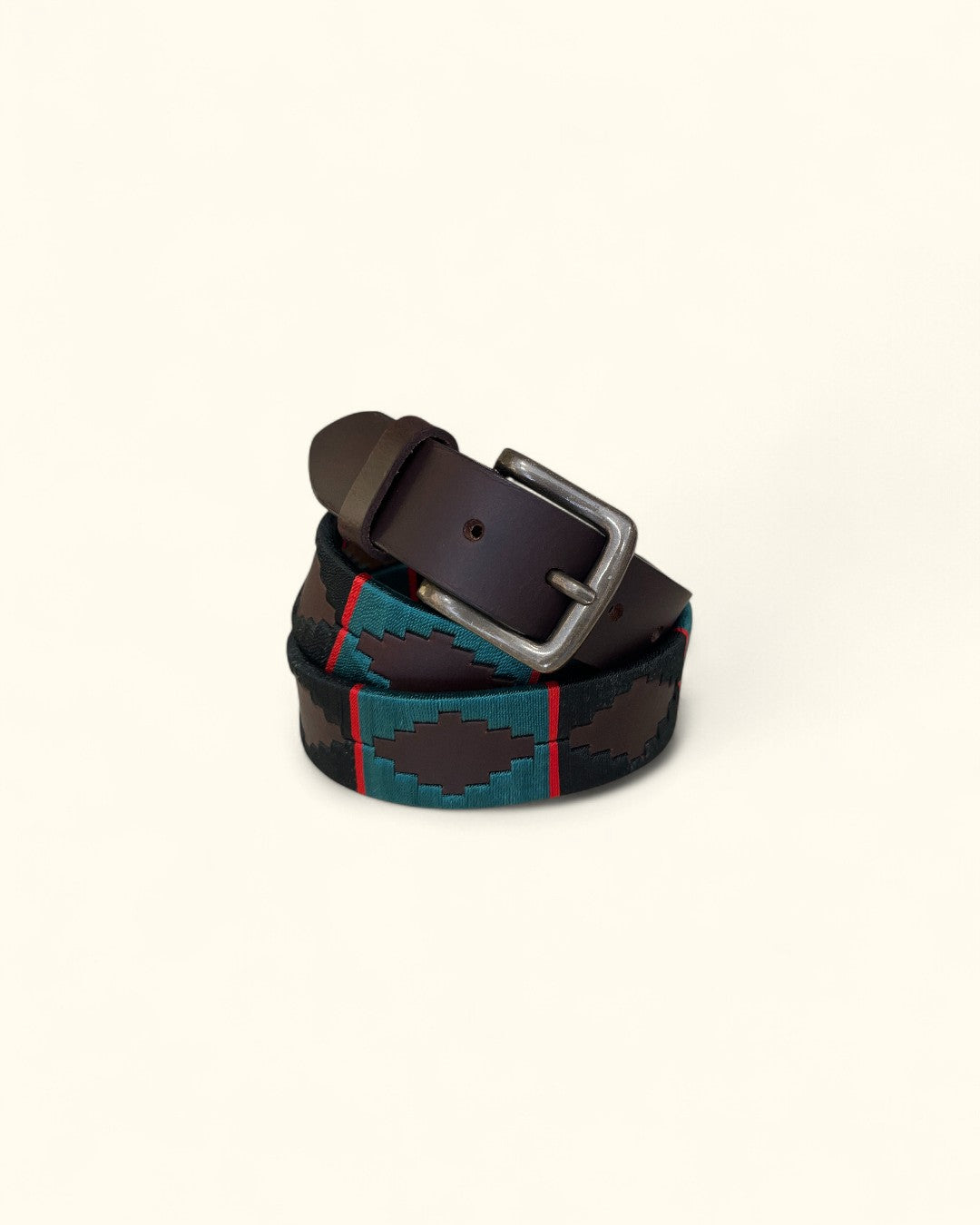 Cinturón estilo polo con base de cuero marrón oscuro y bordados geométricos en tonos verde, rojo y negro. Un diseño elegante con inspiración argentina, ideal para combinar con vaqueros o pantalones chinos. Hebilla metálica envejecida que aporta un toque rústico.