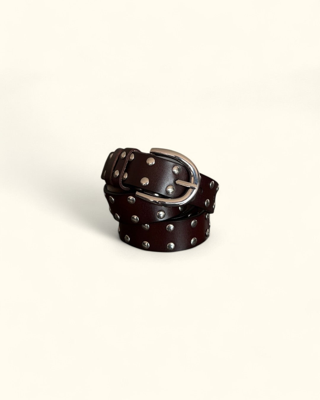 Cinturón de cuero marrón con tachuelas plateadas, perfecto para un estilo atrevido y moderno. Ideal para complementar tus looks casuales con un toque rockero.