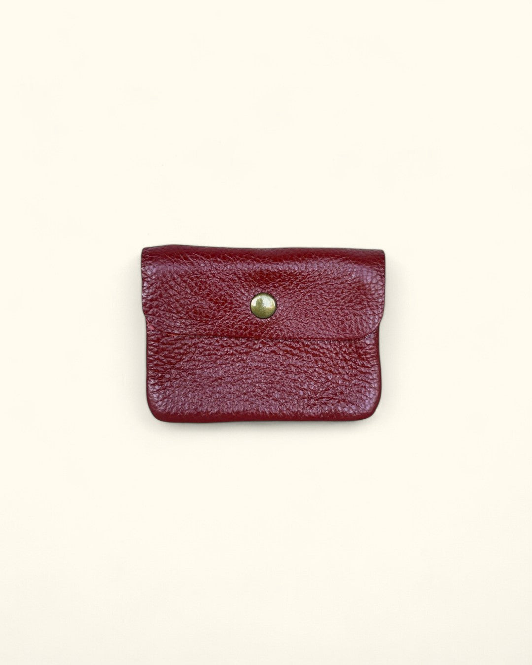 Monedero de piel granate con cierre de botón metálico, perfecto para llevar pequeños esenciales con estilo y comodidad.
