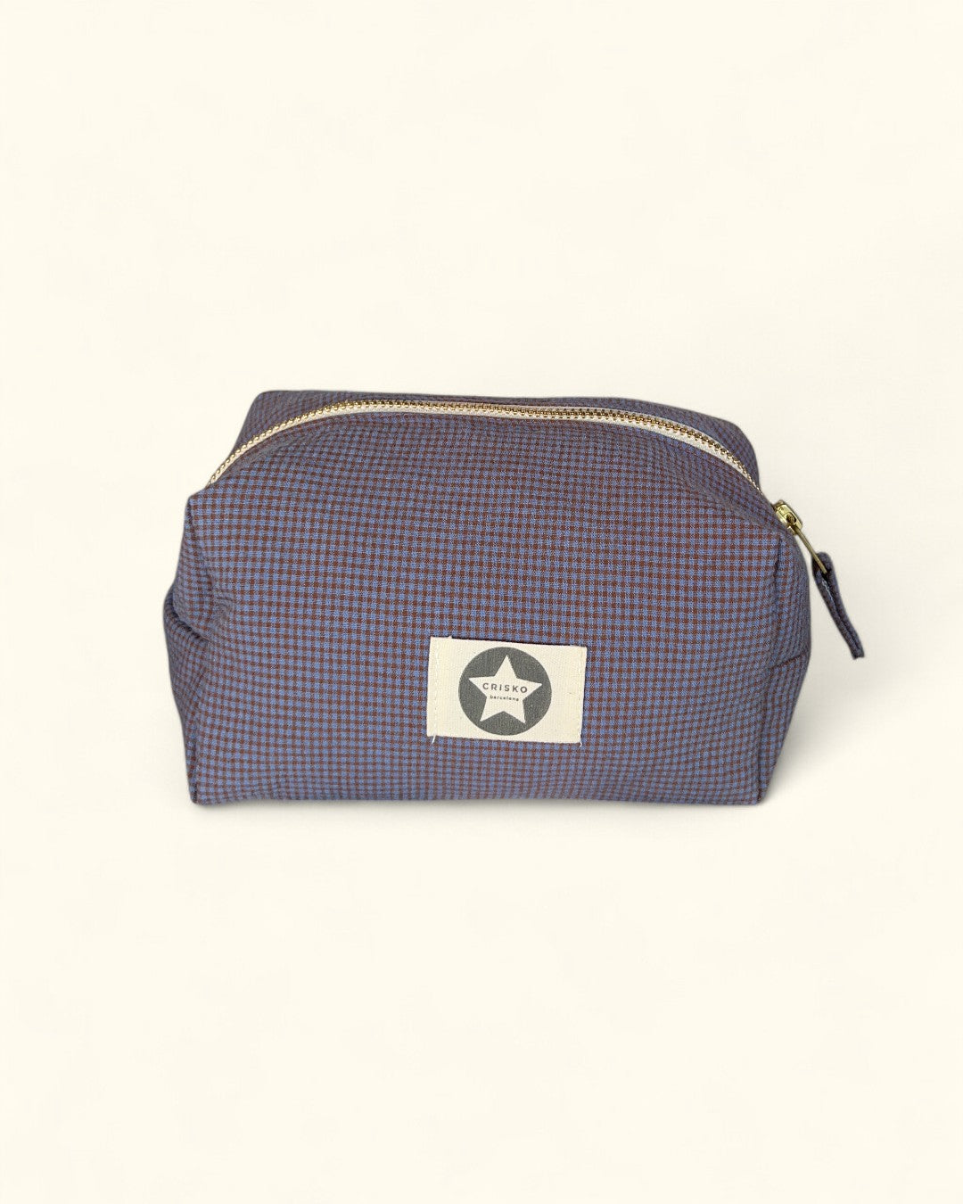 Neceser acolchado con estampado de cuadros en tonos azul y marrón. Su forma tipo caja lo hace ideal para organizar maquillaje, cosméticos o pequeños objetos en casa o de viaje.