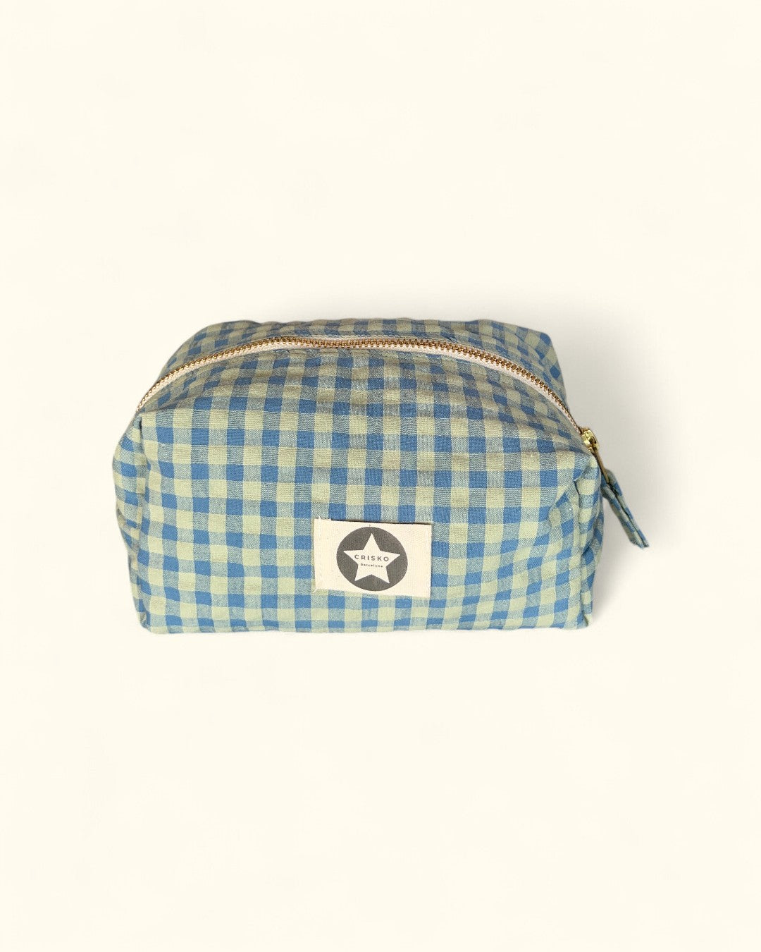 Neceser acolchado con estampado de cuadros en tonos azul y verde. Su forma tipo caja lo hace ideal para organizar maquillaje, cosméticos o pequeños objetos en casa o de viaje.