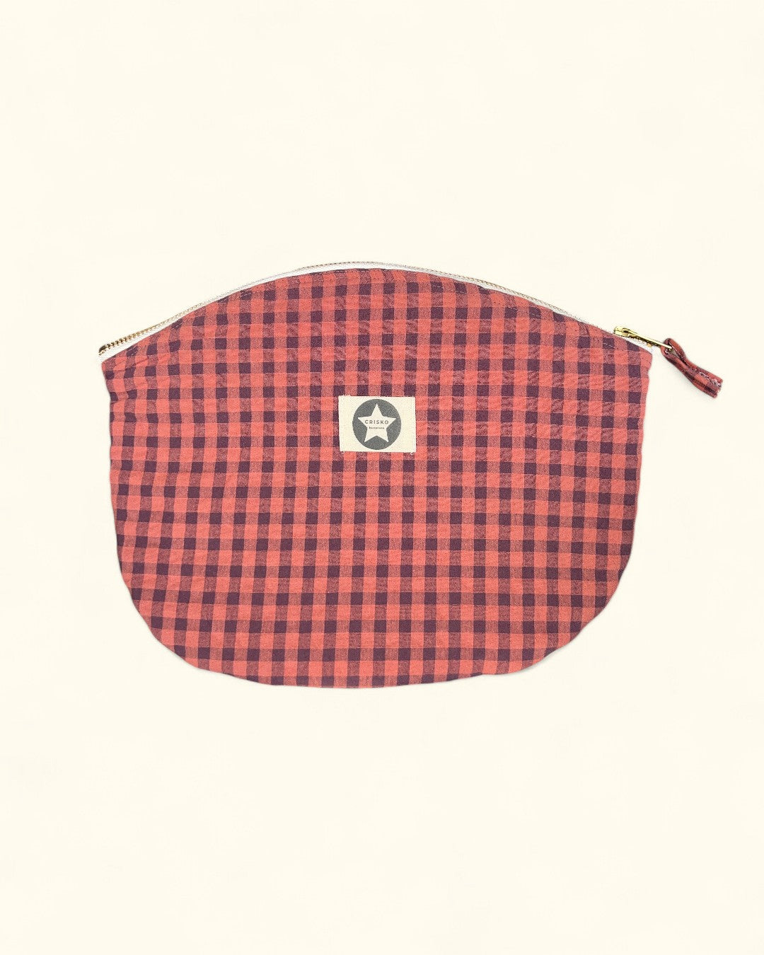 Neceser acolchado de gran capacidad con estampado de cuadros vichy en tonos teja. Ideal para viajar o para organizar productos de cuidado personal. Interior forrado con tejido hidrófugo que lo hace resistente a la humedad. Cremallera metálica con tirador a juego.