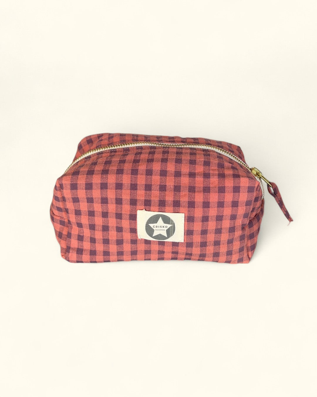 Neceser acolchado con estampado de cuadros en tonos teja. Su forma tipo caja lo hace ideal para organizar maquillaje, cosméticos o pequeños objetos en casa o de viaje.